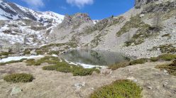 Un effort encore et la découverte du dernier col quelques mètres avant le sommet. Et c’est tout l’univers de la face Nord du Gelas face à nous qui se laisse découvrir avec son reliquat de glacier. Pause déjeuner aérienne bien méritée, et un retour plus judicieux par une petite sente moins chaotique découverte le matin même, au pied des barres rocheuses.