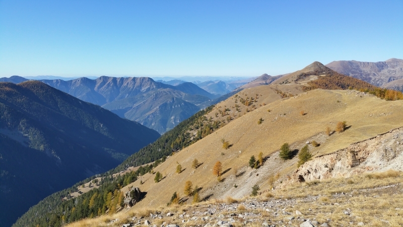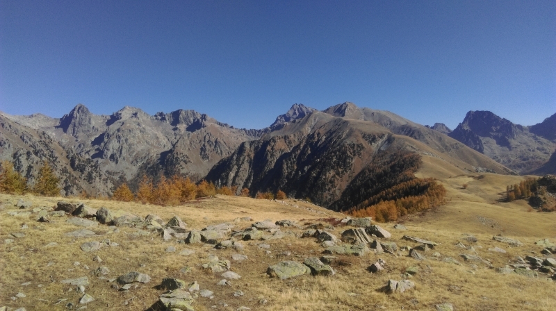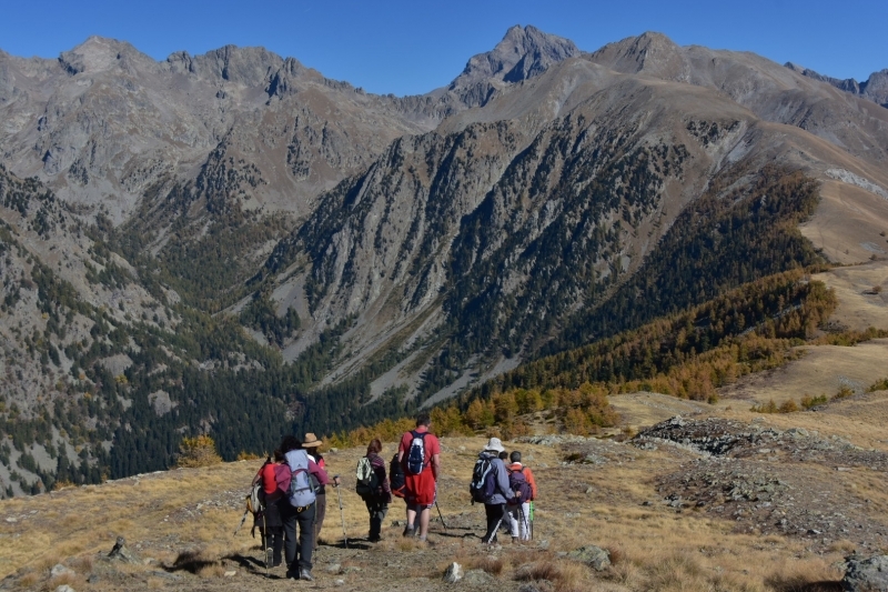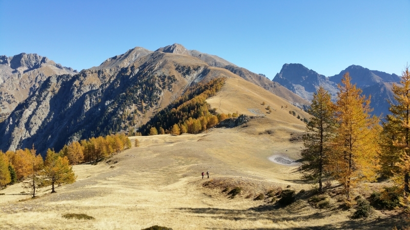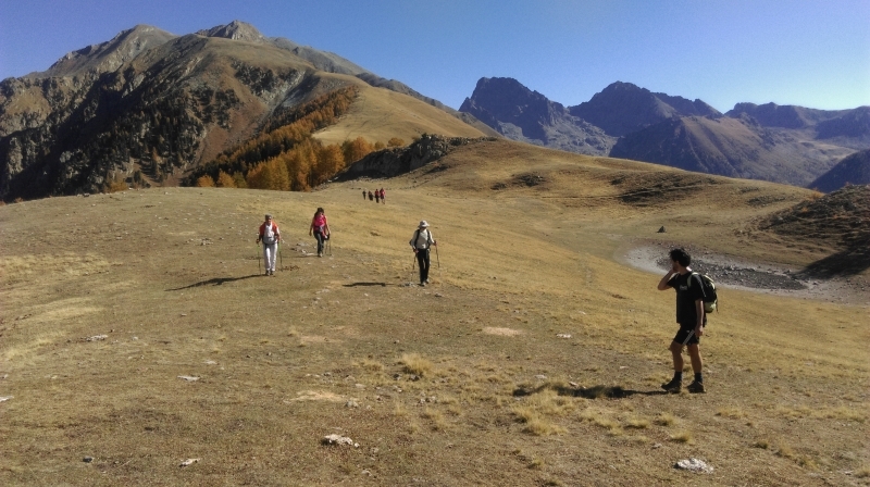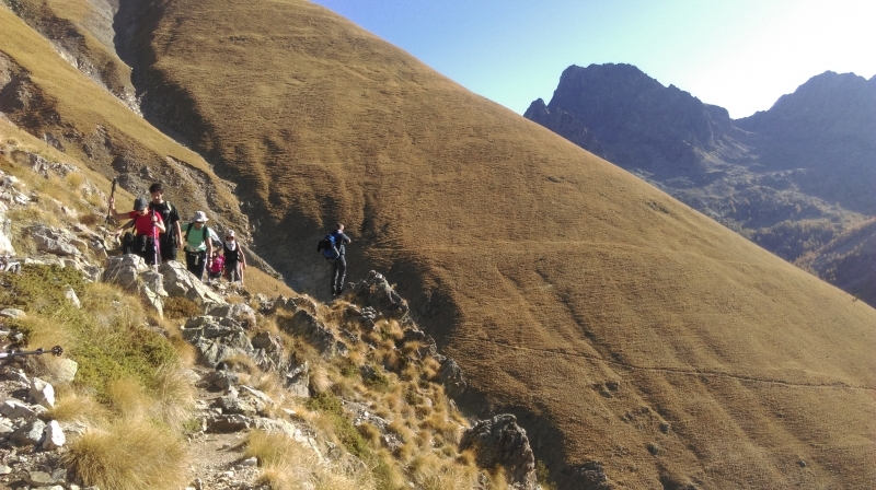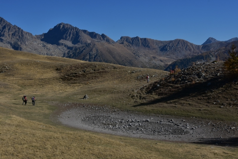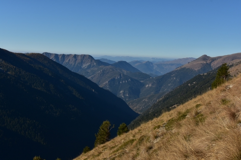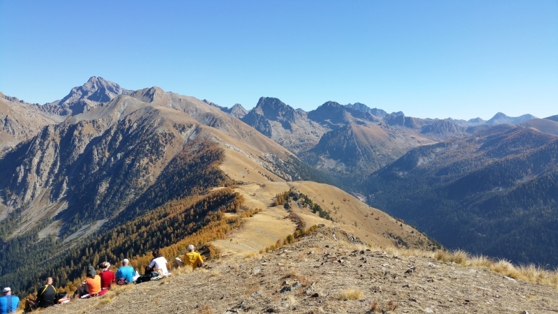 Afin de profitez d’une boucle et de faire la cime du Piagu, nous mettons des voitures à deux endroits différents. Au bout d’une heure de marche, nous sommes déjà arrivés à la cime du Pisset, une magnifique crête qui partage la vallée du Boréon de la vallée de la madone de Fenestre. Un aigle passe. Puis c’est au tour d’une quinzaine de vautours fauves que nous surprenons à tourner au dessus de nos têtes !. Nous continuons notre route en direction de la cime du Piagu, située 150 m plus haut. L’endroit bien que très sec (Il n’a pas plu ici depuis longtemps), est calme et reposant. Nous marchons sur l’herbe. La montée finale à la cime du Piagu n’est pas des plus facile. Mais quel panorama ! vue grandiose sur tous les sommets du département et ses vallées. L’automne bien présent en ce mois d’octobre nous offre ses magnifiques couleurs. L’été indien ne nous quitte pas pour notre plus grand plaisir.