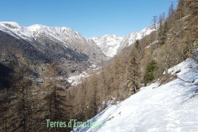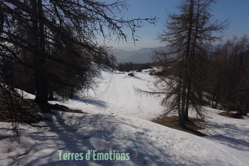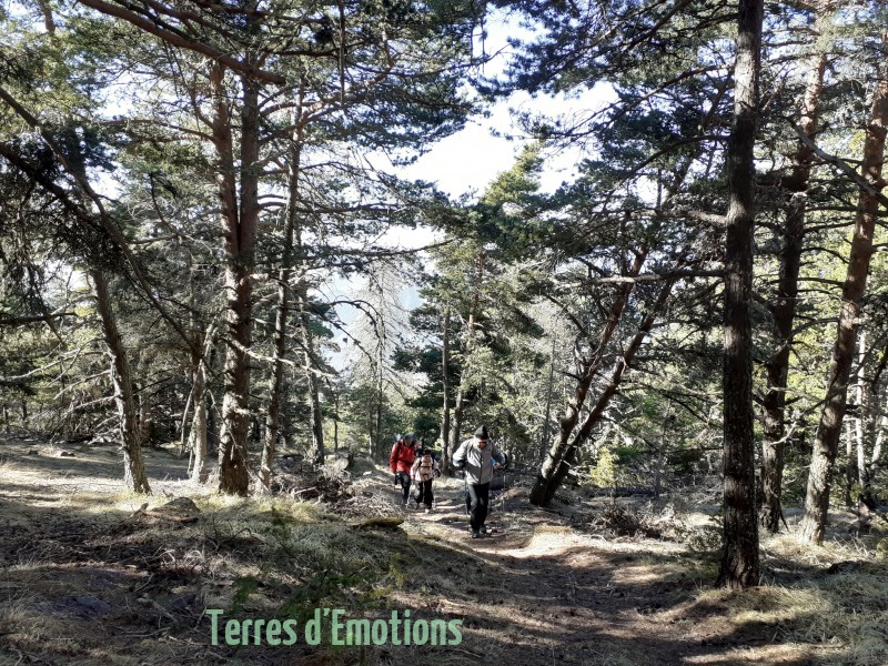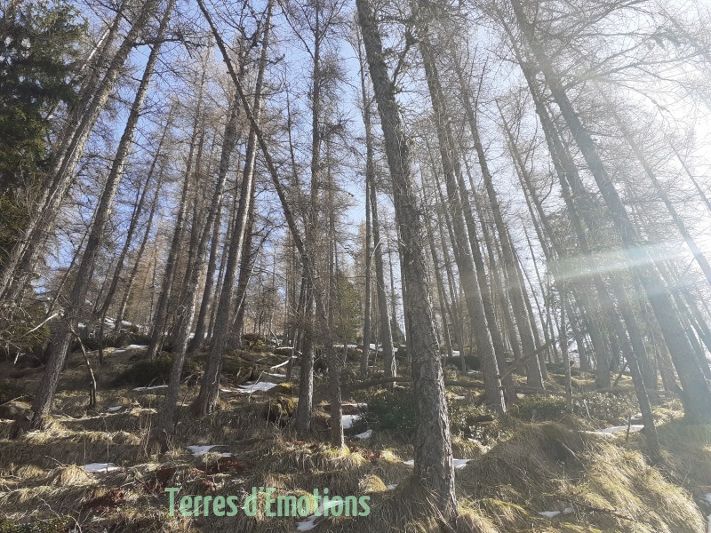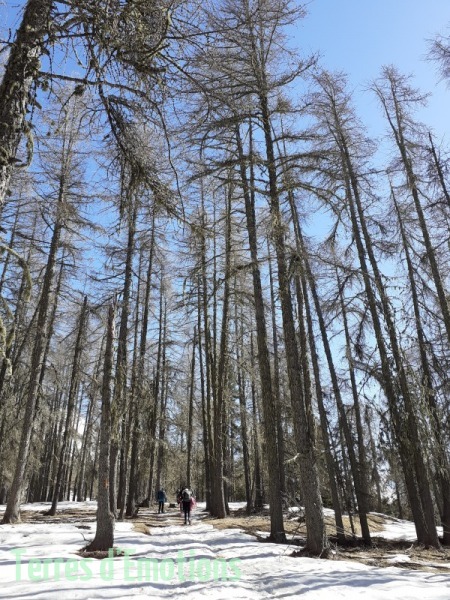 Au retour nous empruntons le sentier qui part de St Grat. La descente se passe dans les pins et sapins. Une forêt magnifique enneigée.