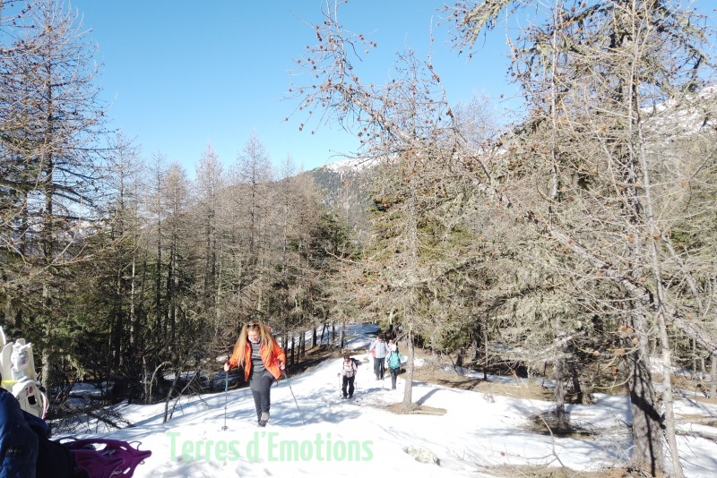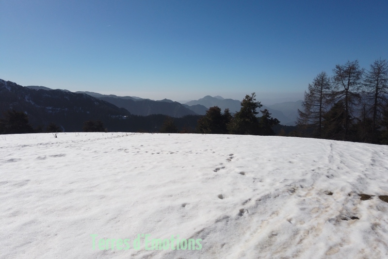 Alors c’est une randonnée mixte aujourd’hui mi-pédestre /mi-raquettes. La neige est présente à 1650 m et c’est donc après 200 m de D+ que les raquettes sont mises aux pieds.