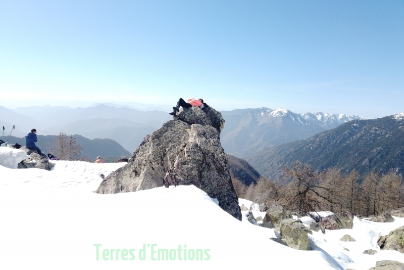 On pousse la marche à 550 m D+ pour aller déjeuner sur un petit éperon dominant la vallée de la vésubie. Le paysage est magnifique, ouvert au sud avec les montagnes du Cheiron et de l’Audibergue.