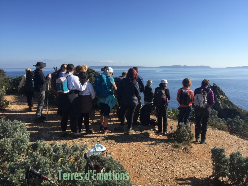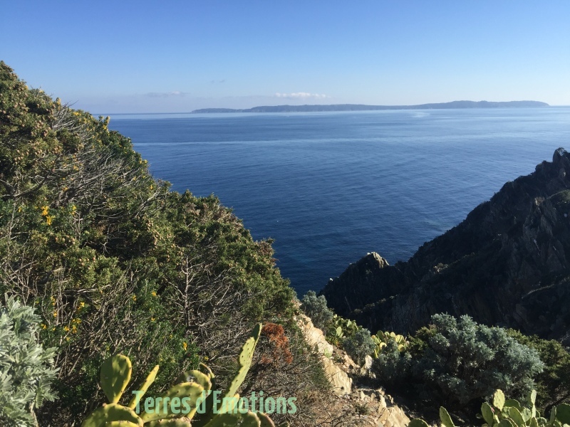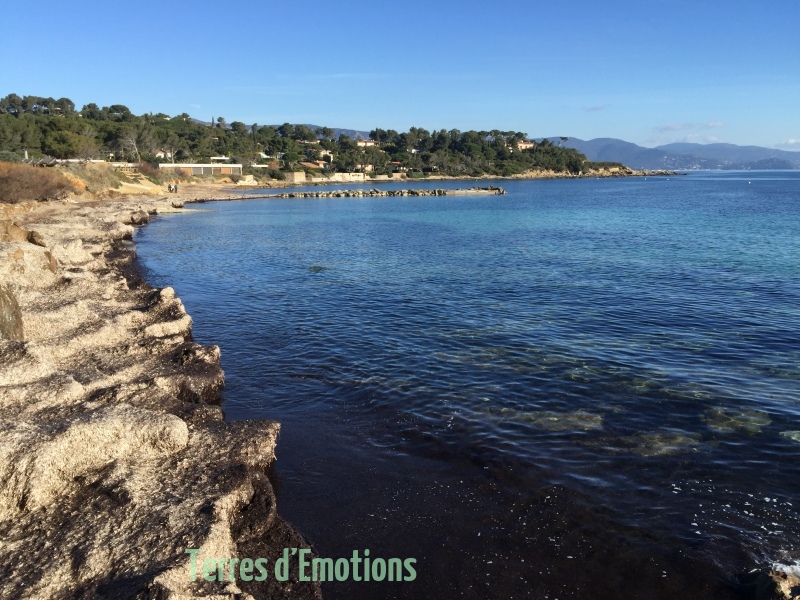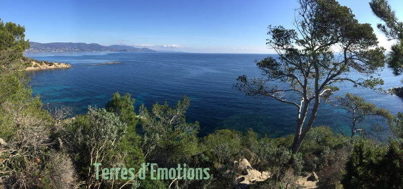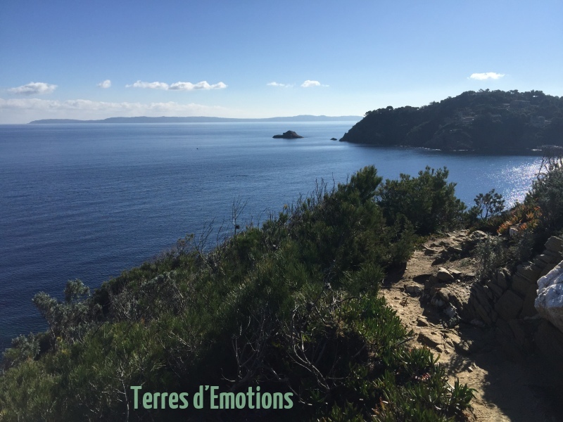 Un parcours sur un sentier des douanier côtier montant et descendant le long des rochers escarpés. Une multitude de couleurs d’une mer calme avec en horizon les iles du levant et de Port Cros.