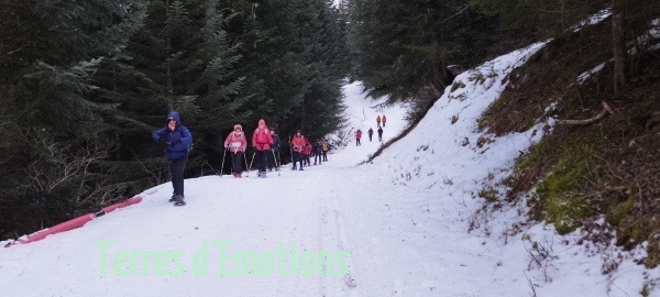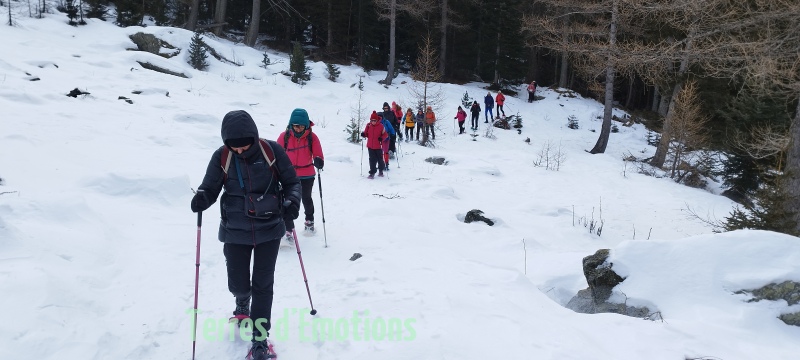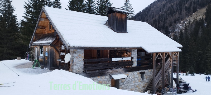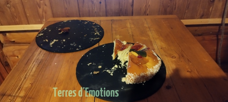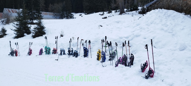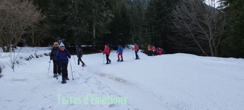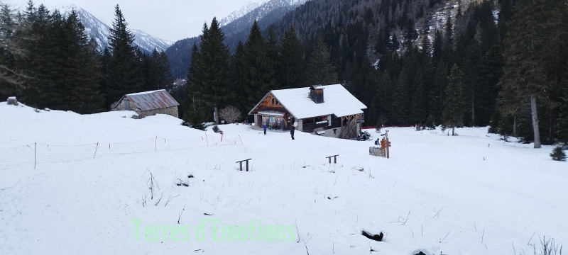 Bien au chaud donc, c’est 18 passionnées de montagne et de galettes (offert par Terres d’émotions avec le cidre) que nous prenons nos aises lors d’un bon repas. Repas convivial qui malheureusement aura une fin et nous poussera dehors à rechausser nos raquettes pour redescendre par un ensemble de dédale de pistes forestières pour revenir par le lac gelé du boréon. Une randonnée digestive appréciable pour tout le monde.