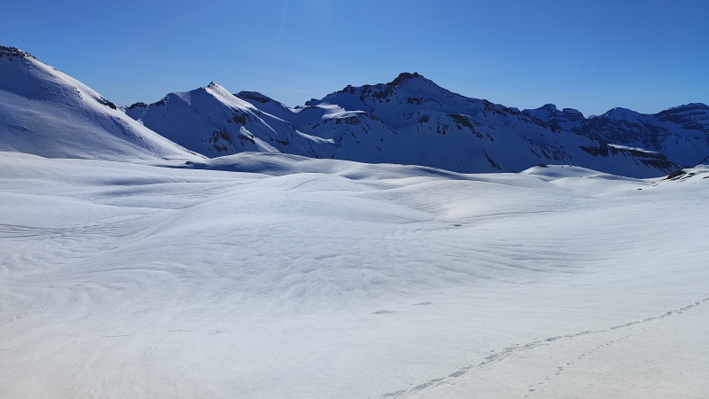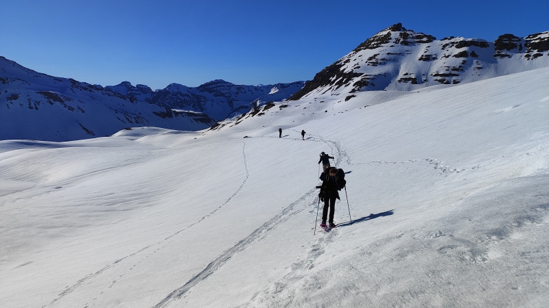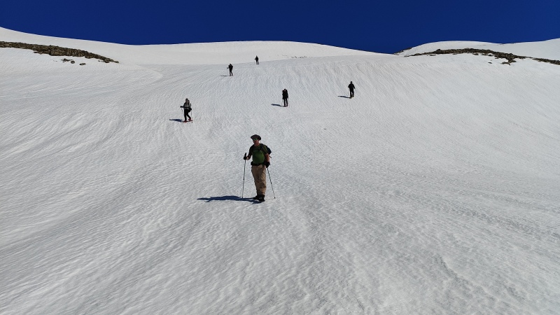De belles pentes enneigées de plus de 2 m de neige. Le soleil nous réchauffe. Au col , nous passons à l’est et le soleil disparait peu à peu. Il reste une heure de marche pour descendre au refuge.