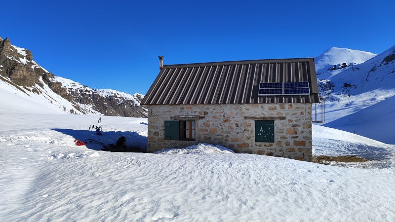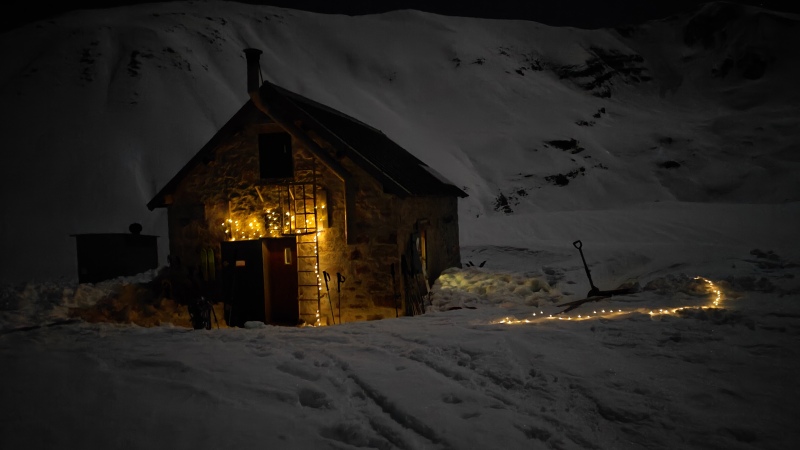 Déchargé du bois des sacs à dos, le poêle est aussitôt rempli pour réchauffer l’atmosphère. Une chaleur salutaire qui nous aidera à passer une super soirée au diner et une nuit au chaud sous les couvertures. Dans la nuit le vent se lève, le feu s’éteint peu à peu. Au petit matin, le poêle est rechargé pour aider à prendre le pdj dans de bonnes conditions.