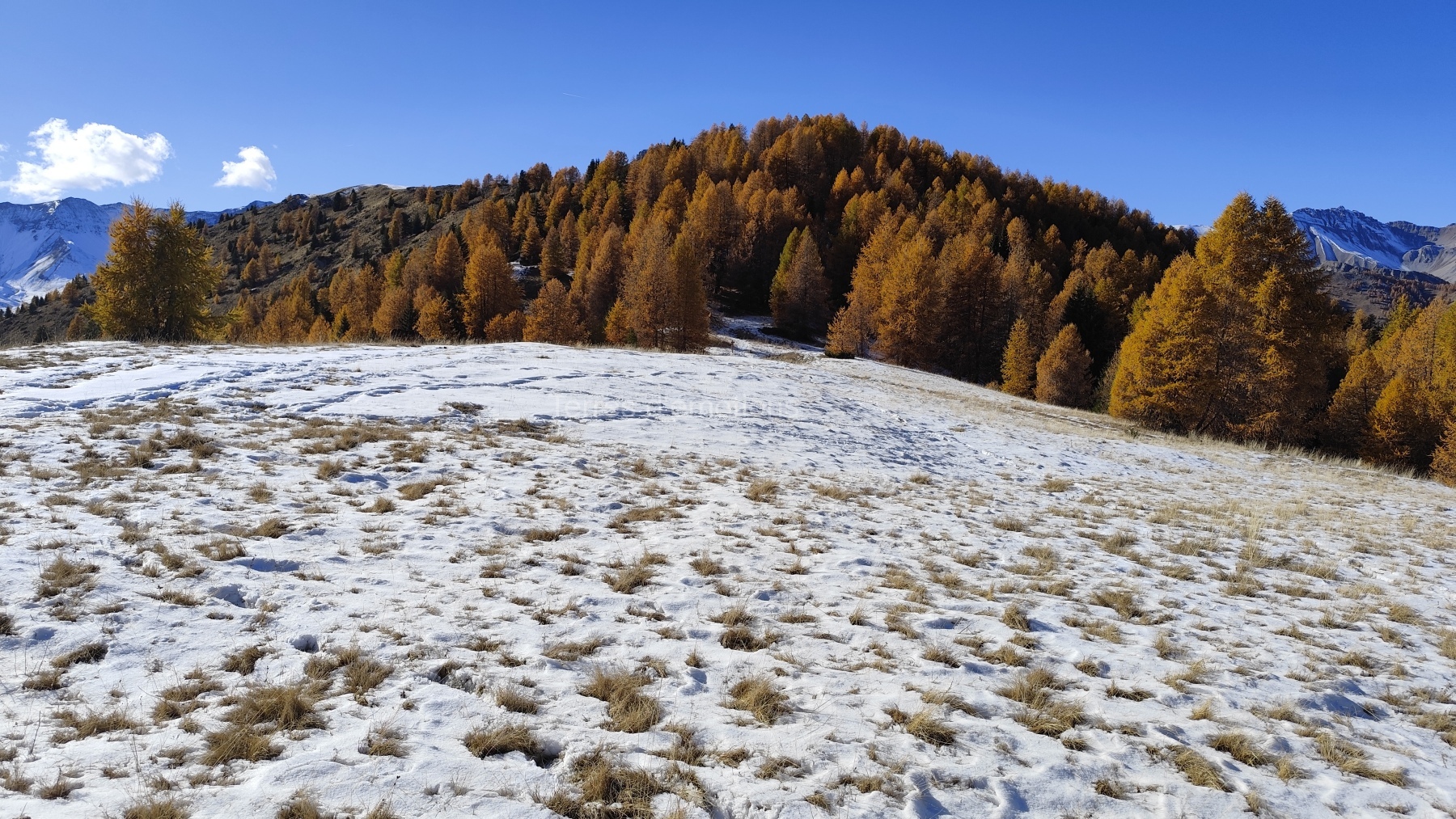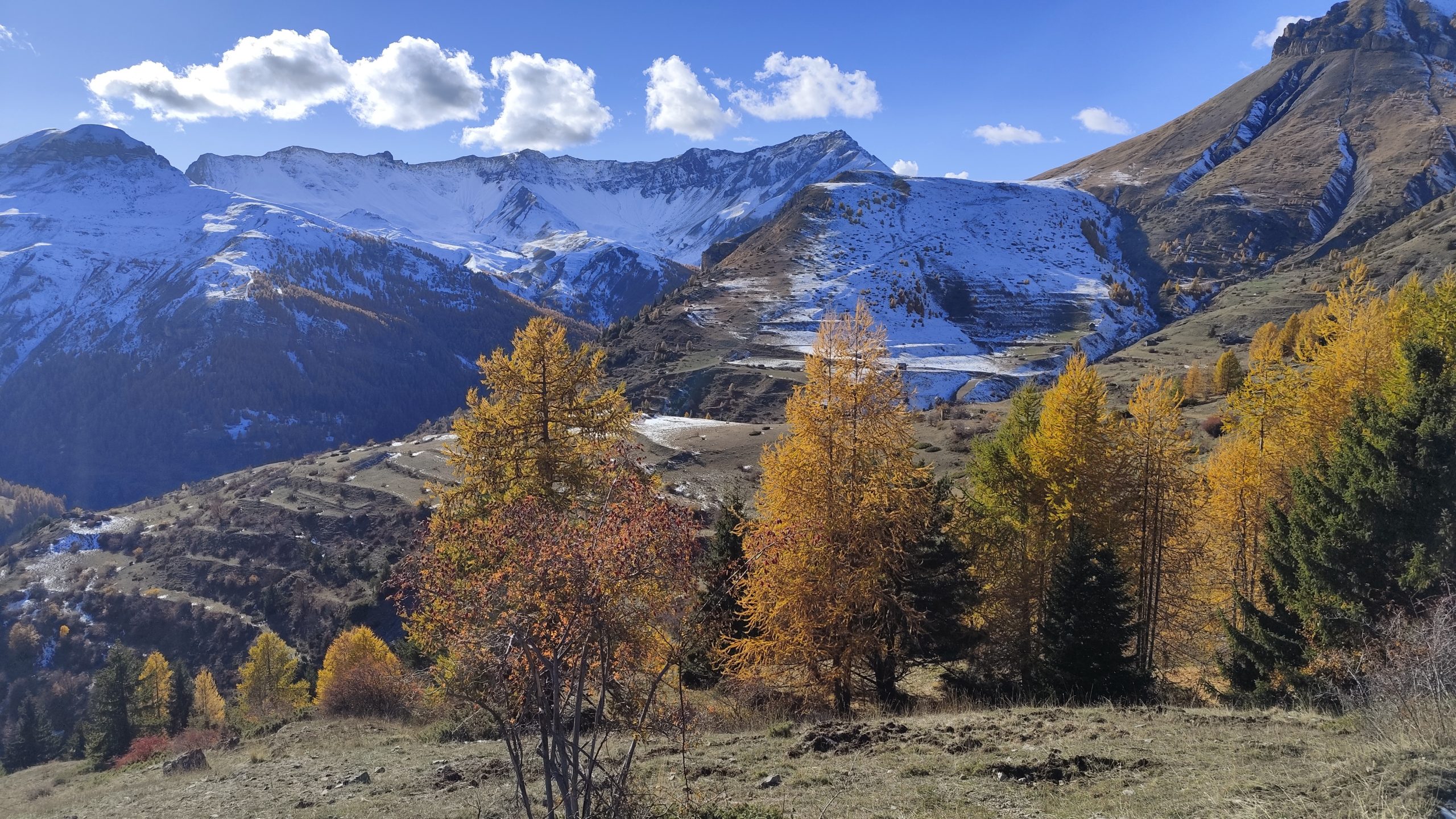 Par une superbe journée d’automne, la randonnée vers le petit hameau de Roya, dans la vallée de la Tinée, a offert un spectacle splendide. Les mélèzes étincelaient d’or, contrastant avec la neige fraîche sur les hauts sommets.